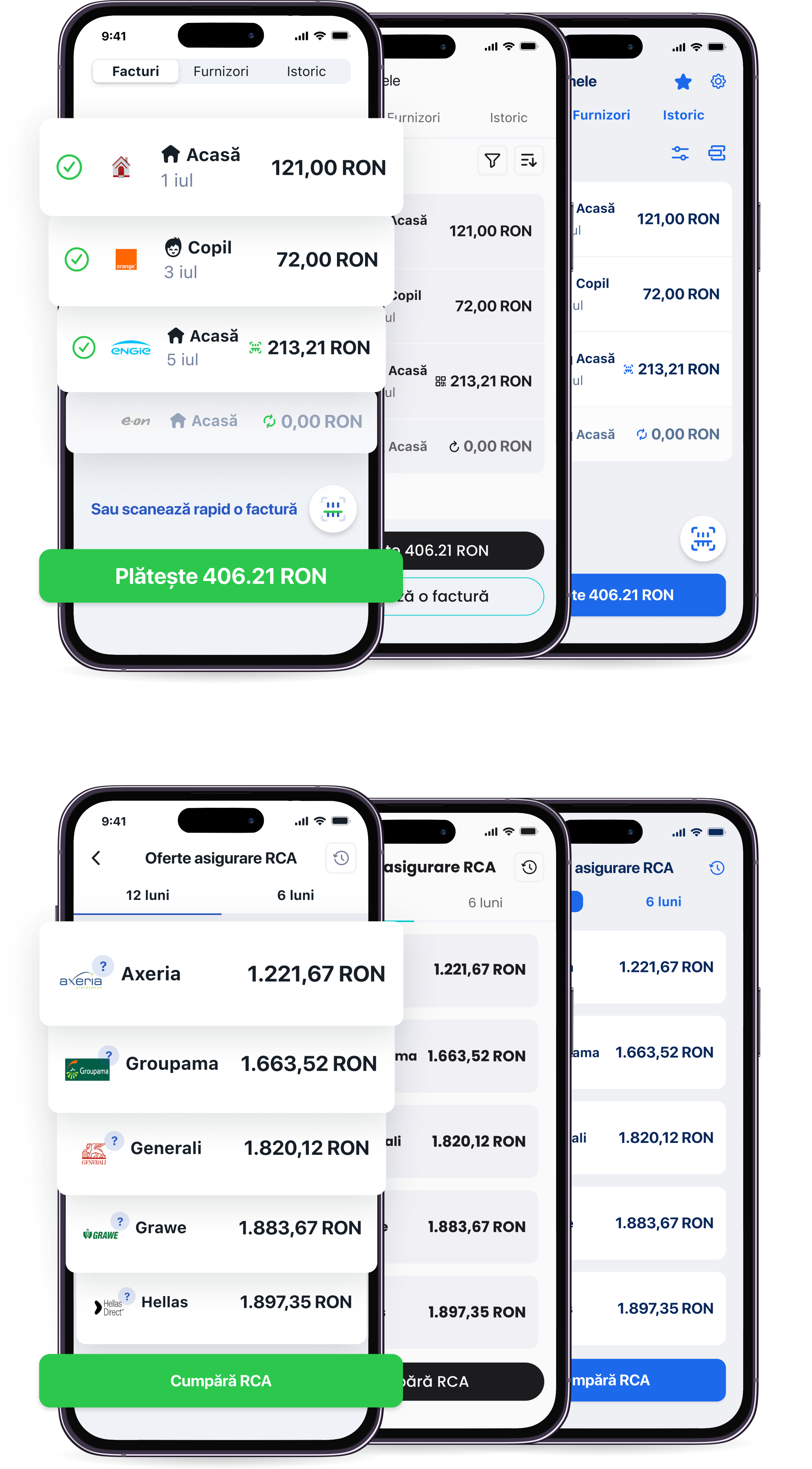 Scapă de grija facturilor. Le primești pe toate într-un singur cont, le ai în ordinea scadențelor într-un singur ecran și le plătești în câteva secunde, de oriunde și oricând.